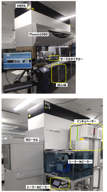 (自動分注機Fluent1080, 遠心機Rotanta460,一体型シーラー&ピーラーHJ Bioanalytik SealPeelStation, インキュベーターLiconic STX44(4℃保存用, 振とう培養用), エレポ装置 4D nucleofector, プレートリーダーINFINITE 200 Pro M NANO+, サーマルサイクラーODTC 96, HEPAフィルター, コロニーピッキングモジュール, プレーティングモジュール, カローセル)